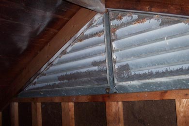 Rats and squirrels were entering the attic through this large gable vent. Look at the flimsy and deteriorated old screen that we replaced with new steel.