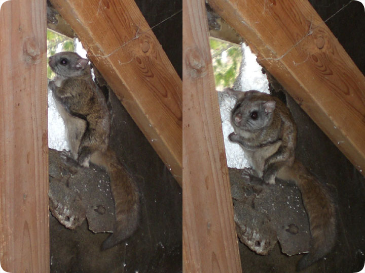 These photos show a flying squirrel about to leave the attic via its exit hole near the peak of the roof, at the
