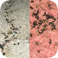| Here are two different photos of rat poop in an attic. On the left is a heavily-used rat pathway in an attic with blown-in fill insulation. On the right